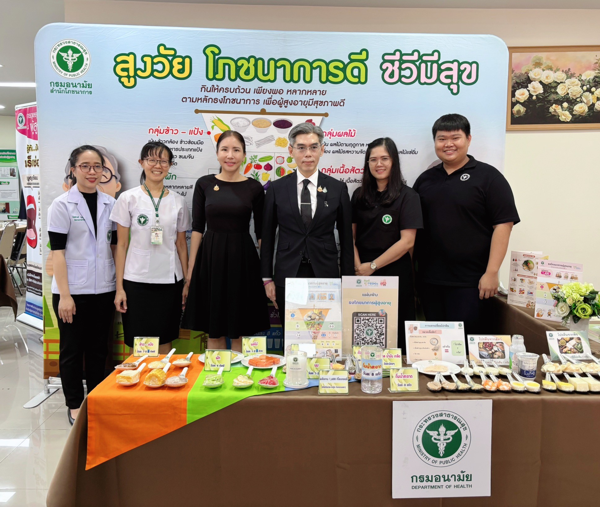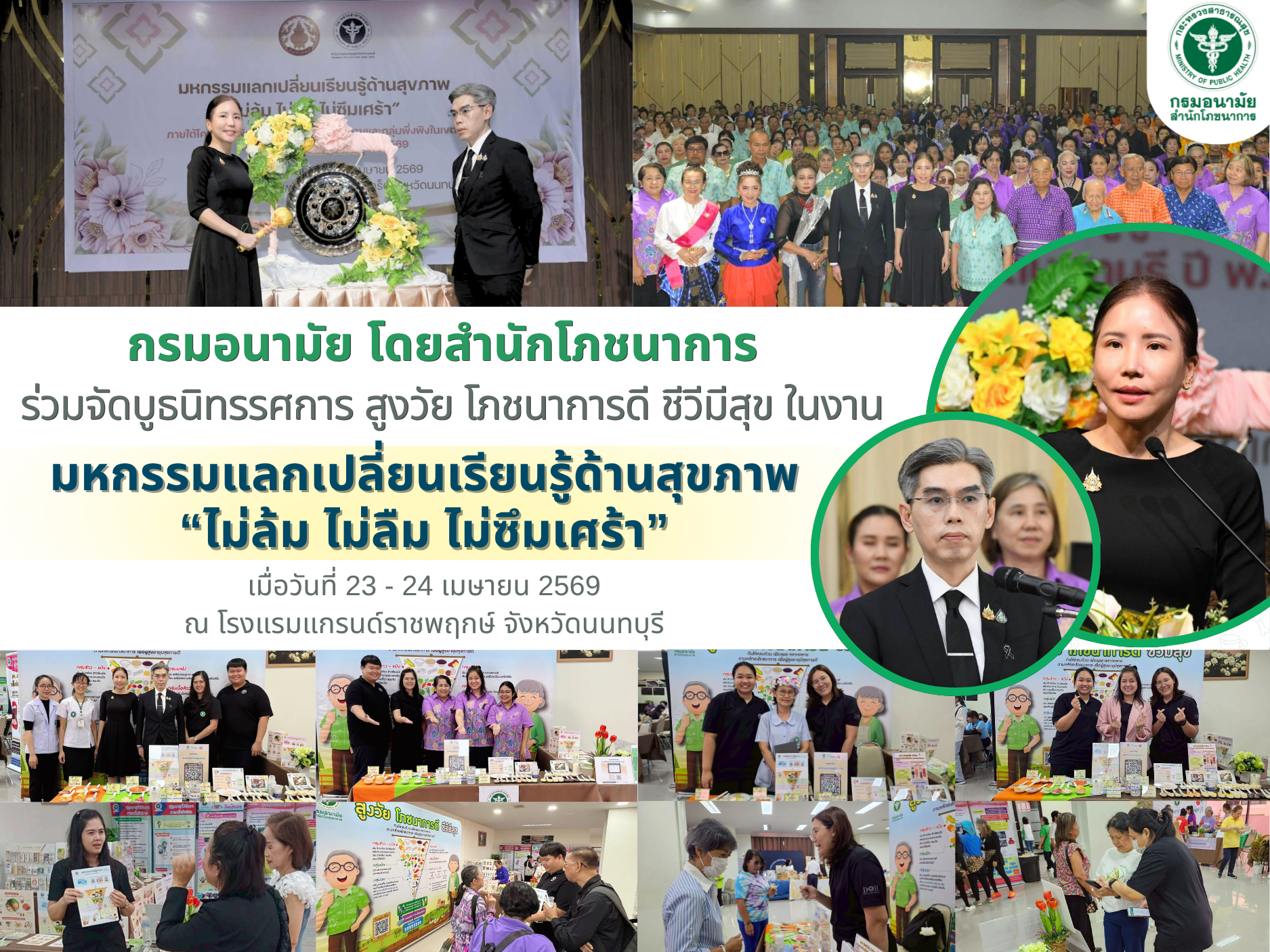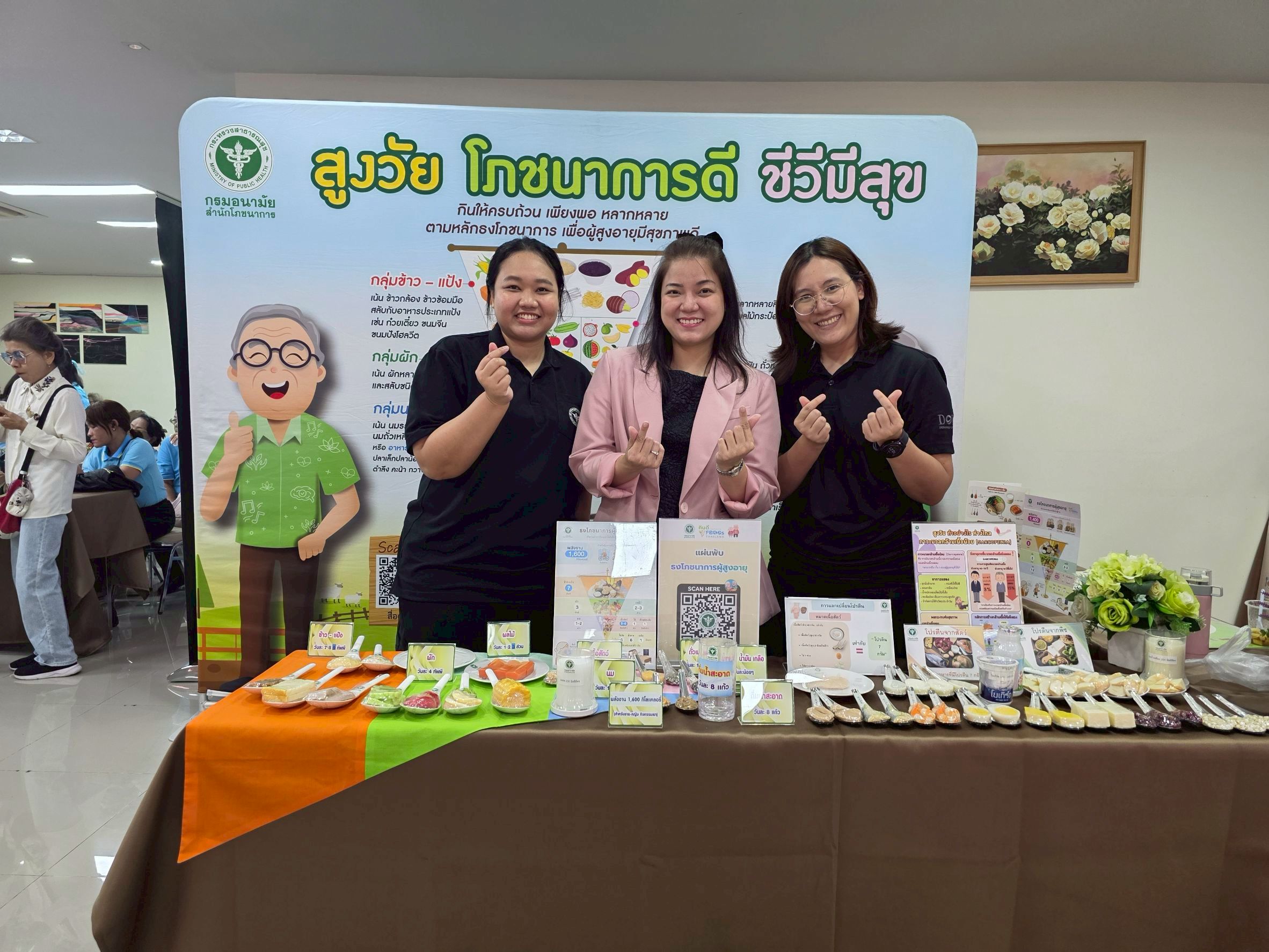 เมื่อวันที่ 23-24 เมษายน 2569 ดร.พญ.สายพิณ โชติวิเชียร ผู้อำนวยการสำนักโภชนาการ กรมอนามัย มอบหมายให้นักวิชาการจากสำนักโภชนาการ เข้าร่วมงาน มหกรรมแลกเปลี่ยนเรียนรู้ด้านสุขภาพ “ไม่ล้ม ไม่ลืม ไม่ซึมเศร้า” พร้อมจัดบูธนิทรรศการด้านโภชนาการ ประกอบด้วย ธงโภชนาการสำหรับผู้สูงอายุ อาหารเสริมสร้างโปรตีน และโปรแกรม Nutrition AI มาร่วมจัดแสดง เพื่อส่งเสริมความรอบรู้และพฤติกรรมการบริโภคอาหารที่เหมาะสมสำหรับผู้สูงอายุ